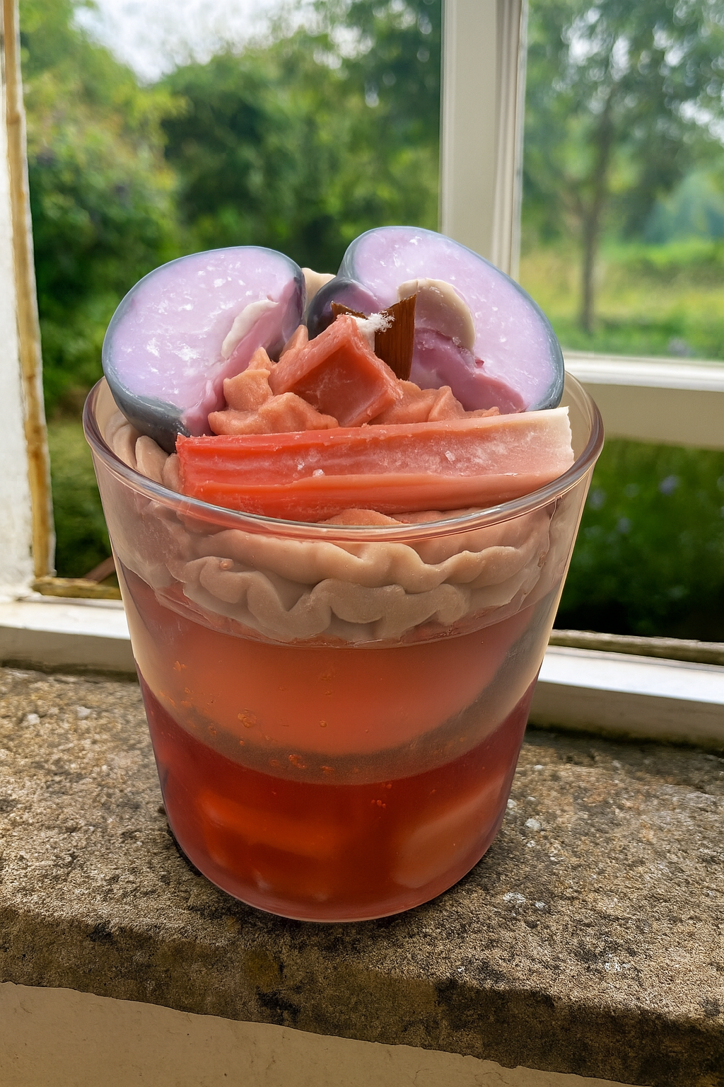 • Realistic plum & rhubarb pieces in clear gel