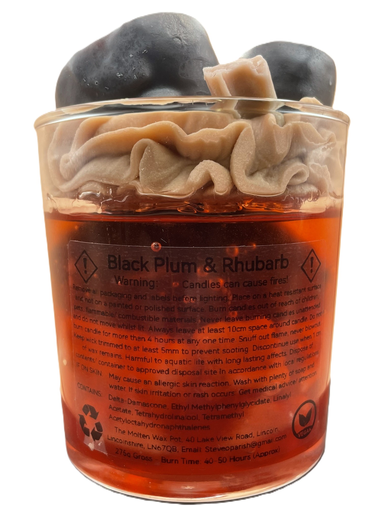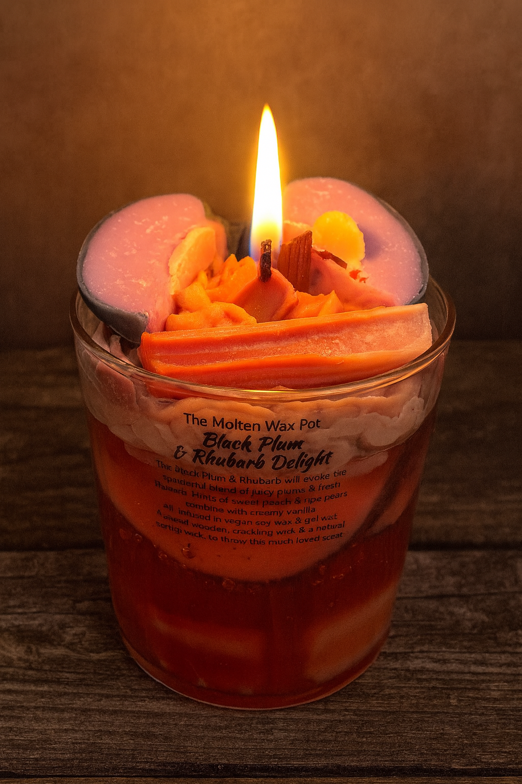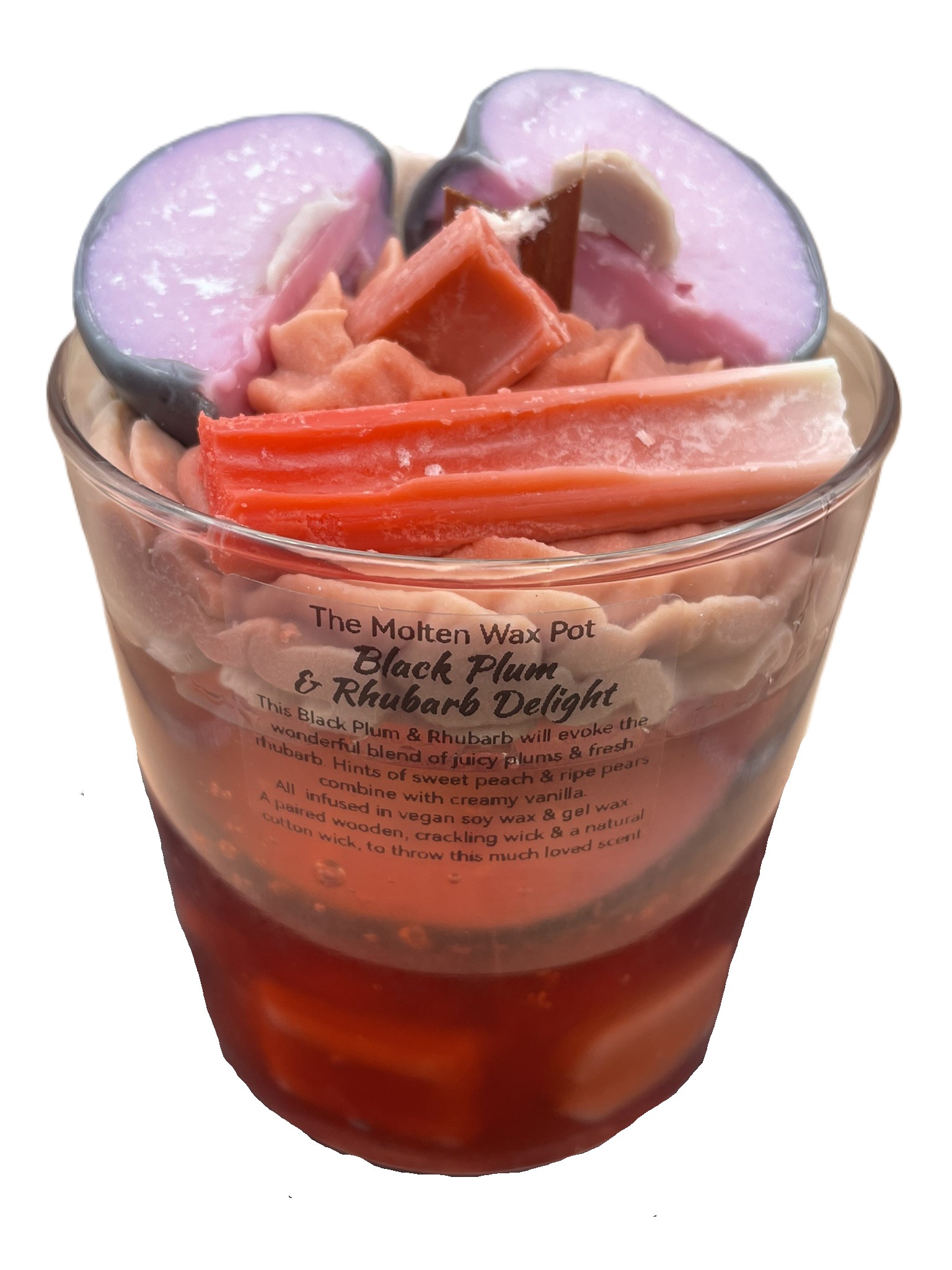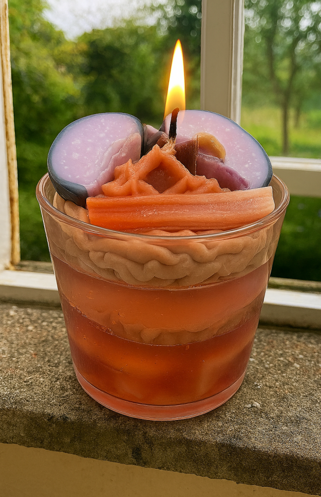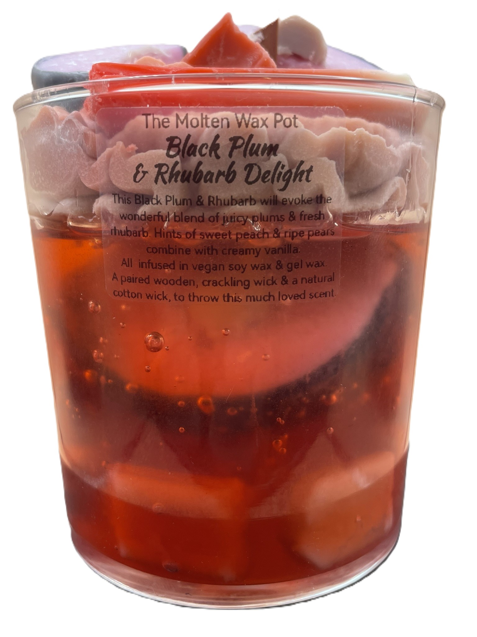 A juicy blend of black plum, tart rhubarb, and soft fruity notes, crafted in a glowing gel‑and‑whipped‑wax design that looks as beautiful as it smells.