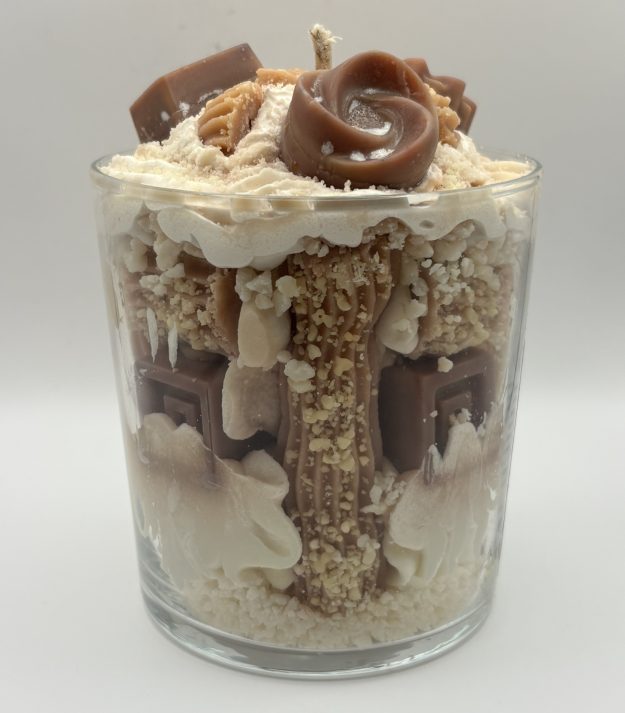 A cosy, bakery‑inspired candle blending warm churros with rich chocolate fudge brownie. Each one is hand‑poured in vegan soy wax and finished with realistic churro and brownie wax pieces for a comforting dessert‑style look. The candle sits in a heat‑tempered glass container and has a soft, warm glow as it burns.