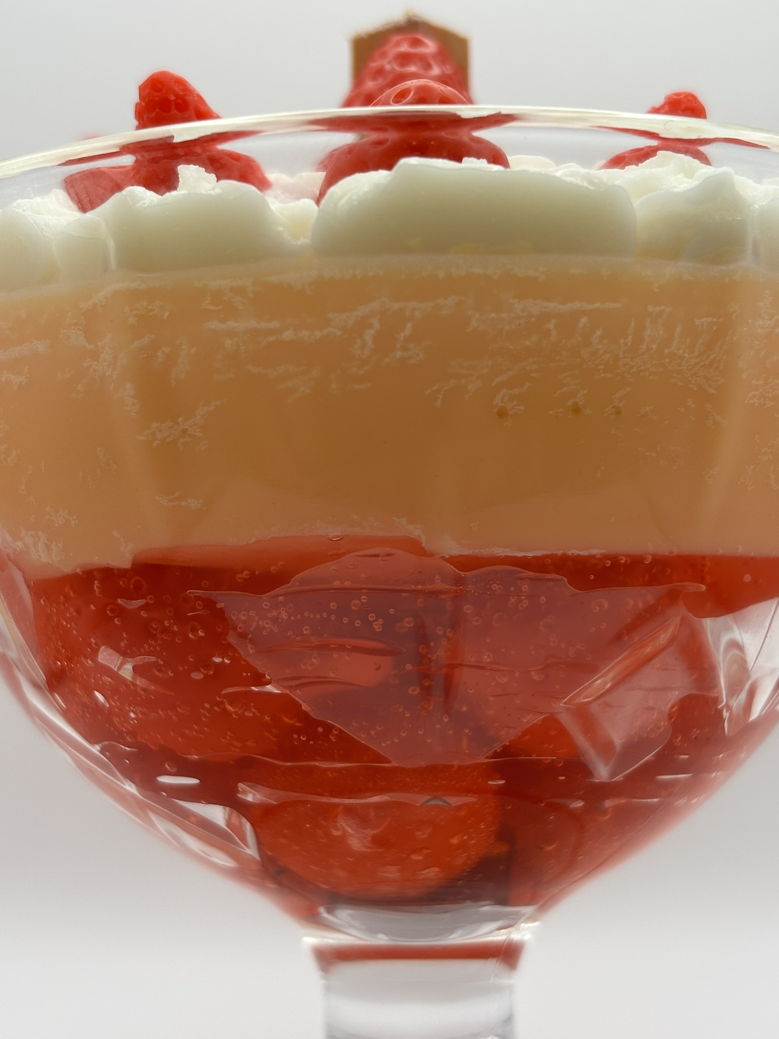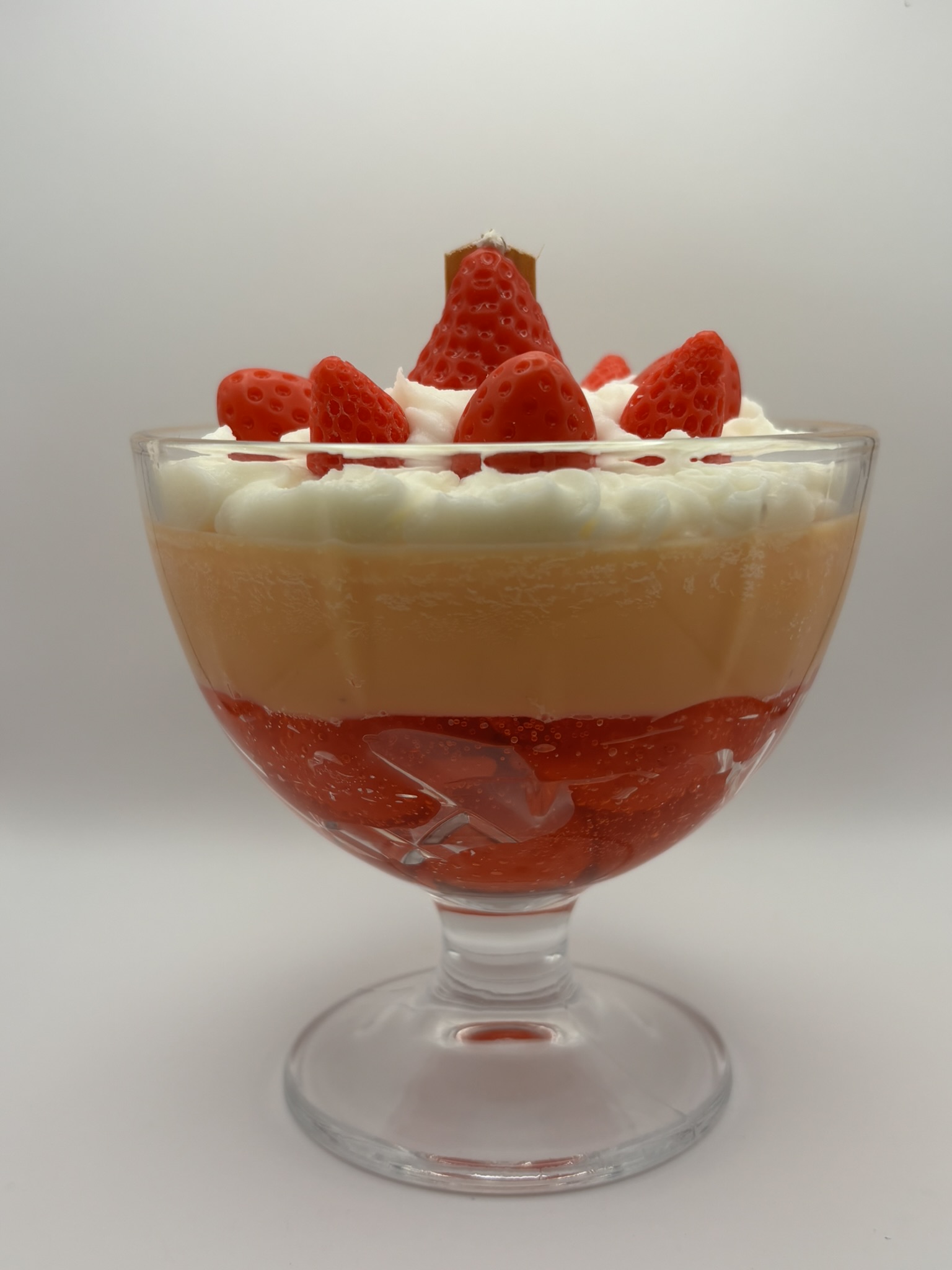Bring cosy nostalgia into your home with this handmade Strawberry Trifle Candle by The Molten Wax Pot. Designed to look like a real layered trifle, it features realistic strawberries, creamy custard‑style wax, and whipped topping — all poured into a heat‑tempered glass container.