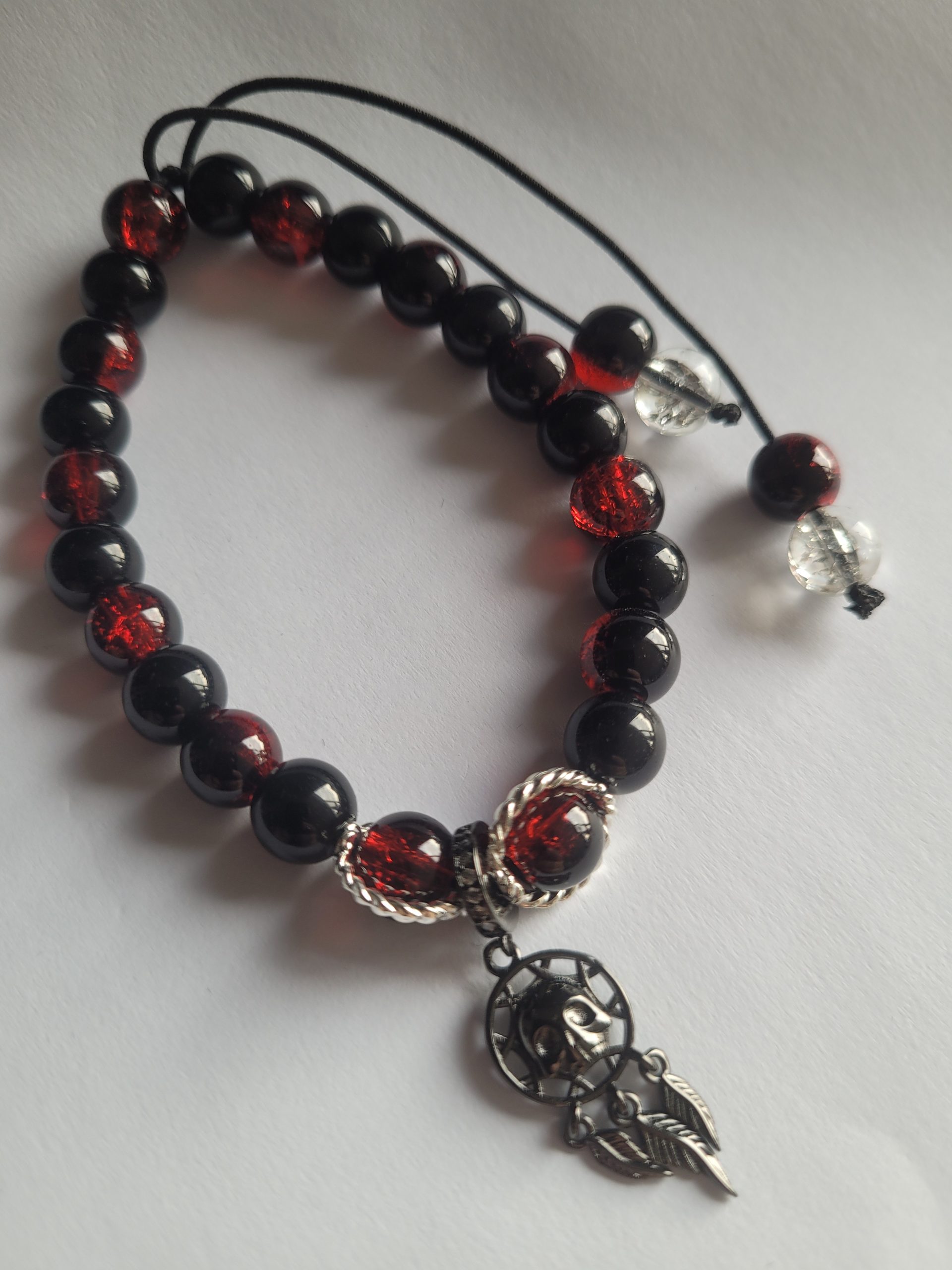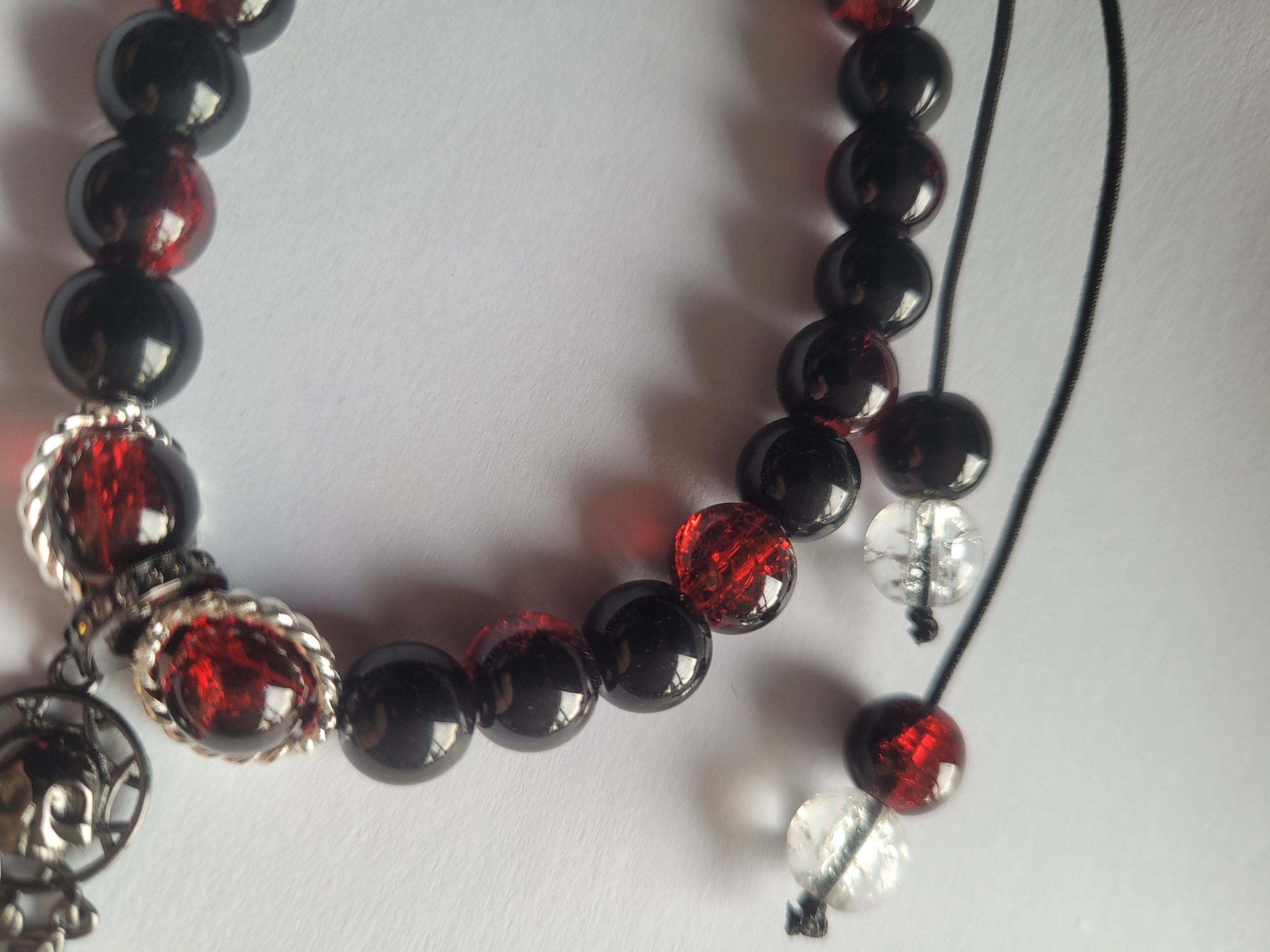 This handcrafted bracelet is made with glossy black beads paired with rich, ruby-red glass beads that catch the light beautifully. Each red bead is framed with silver-tone accent rings, adding shine and contrast. The bracelet is finished with a striking silver-plated charm featuring delicate detailing and dangling elements that give the piece movement and personality.