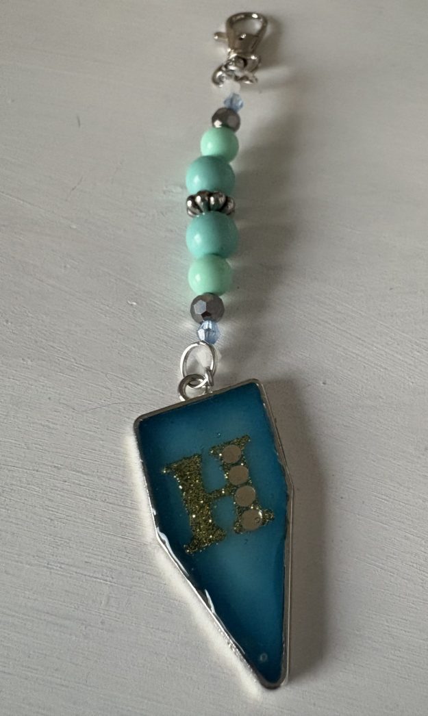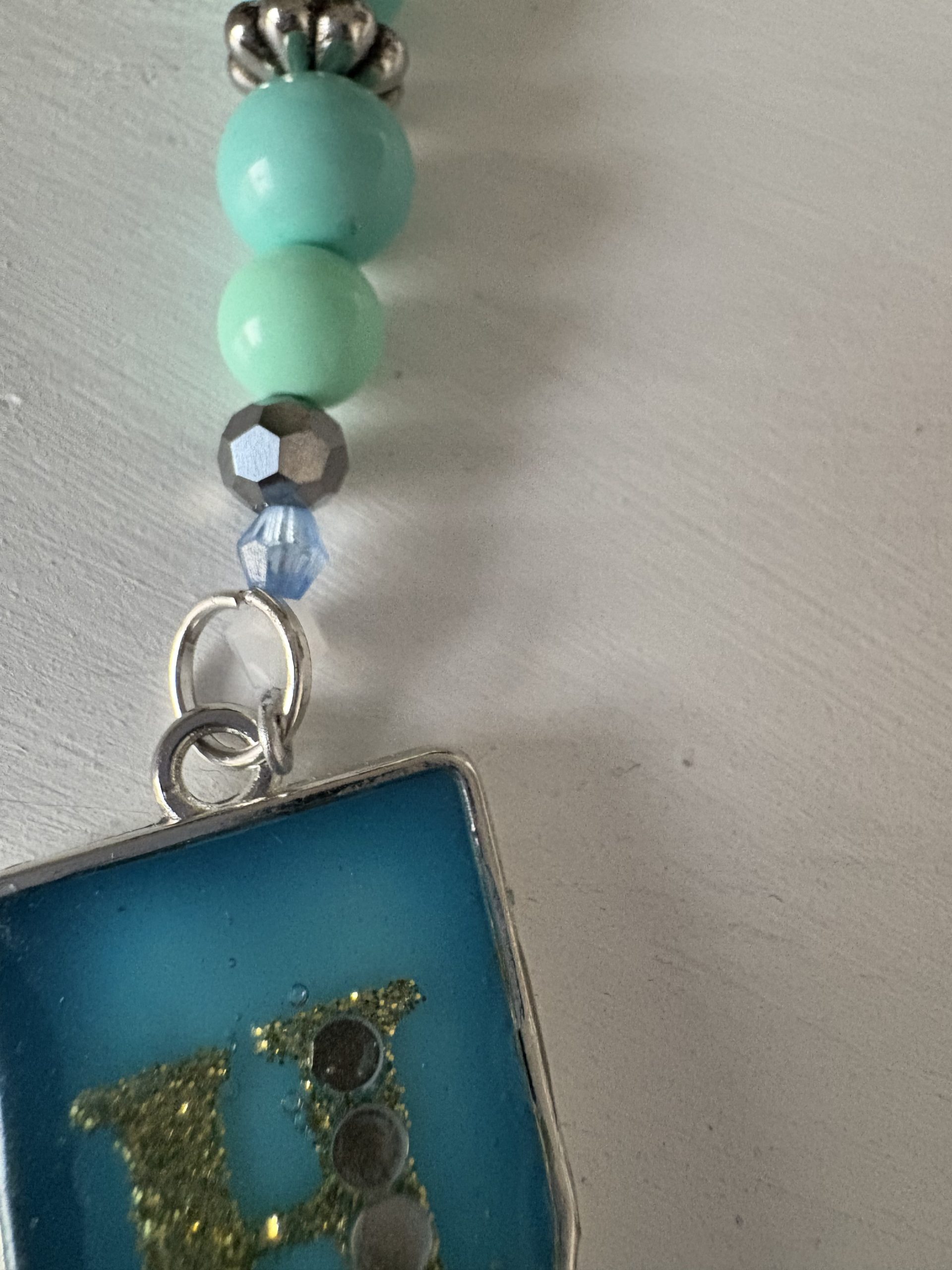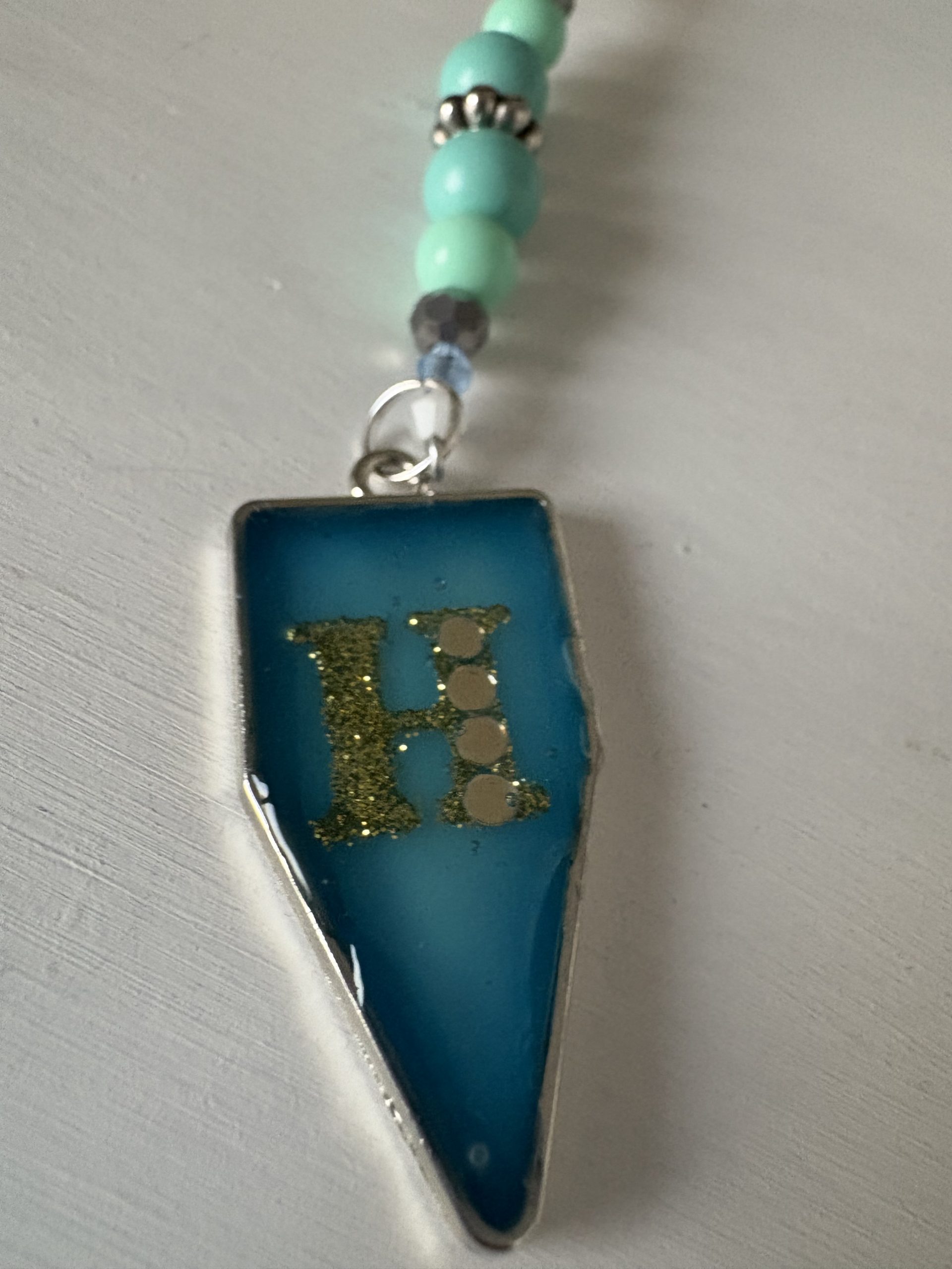 With the letter ‘H’ in a pendant as the main feature with various tones of aqua green beads it is a perfect addition to your collection or as a gift for someone that means something to you.