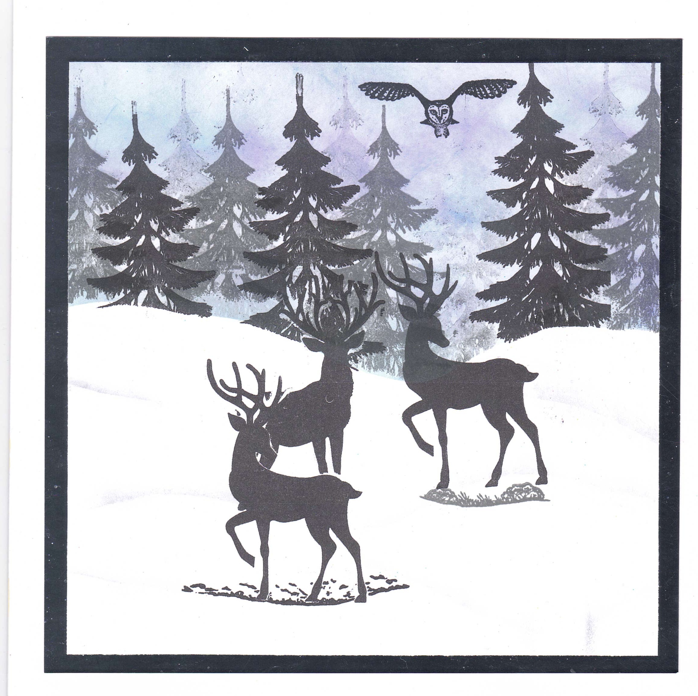 Handmade Card featuring a Winter Scene created with Blended Inks and silhouette stamping