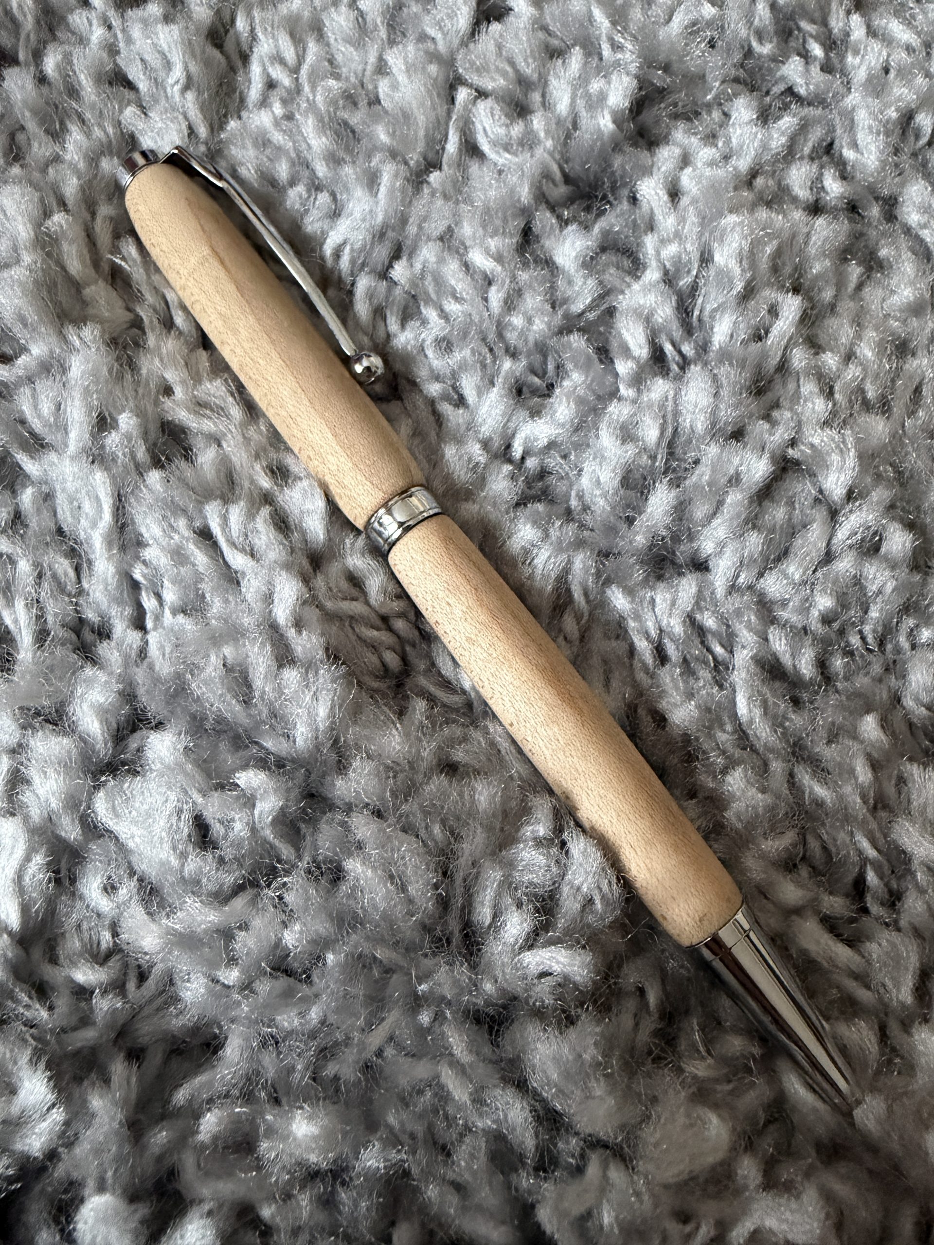 Meet your new favourite pen! This sleek twist action ballpoint is crafted from beautiful light toned hardwood, offering a comfortable grip and a touch of natural elegance. It’s built for everyday use, whether you’re signing documents, jotting down ideas, or making your shopping list. Simple, stylish, and sustainable- it’s the perfect gift or a personal treasure. These pans are also refillable.