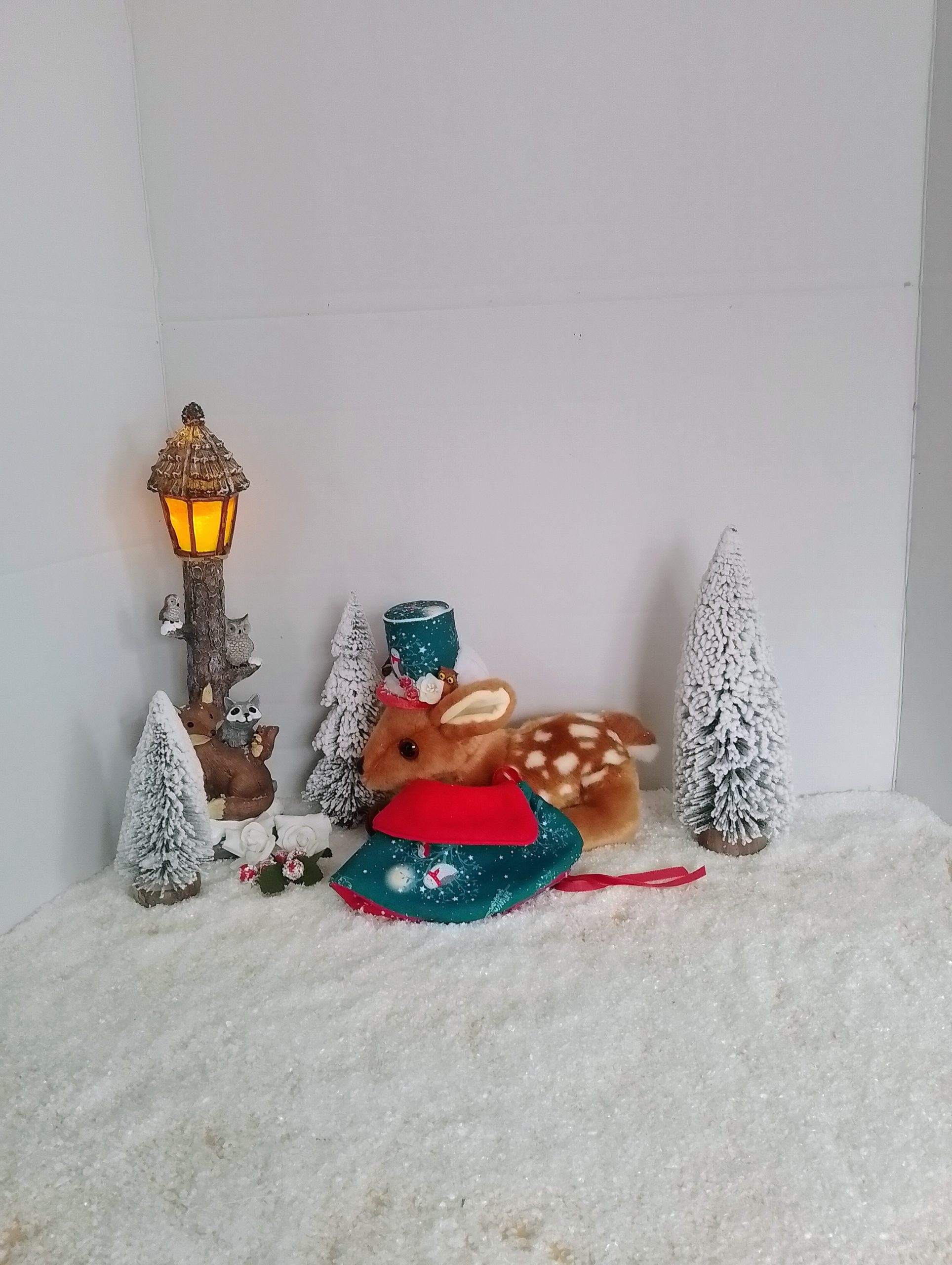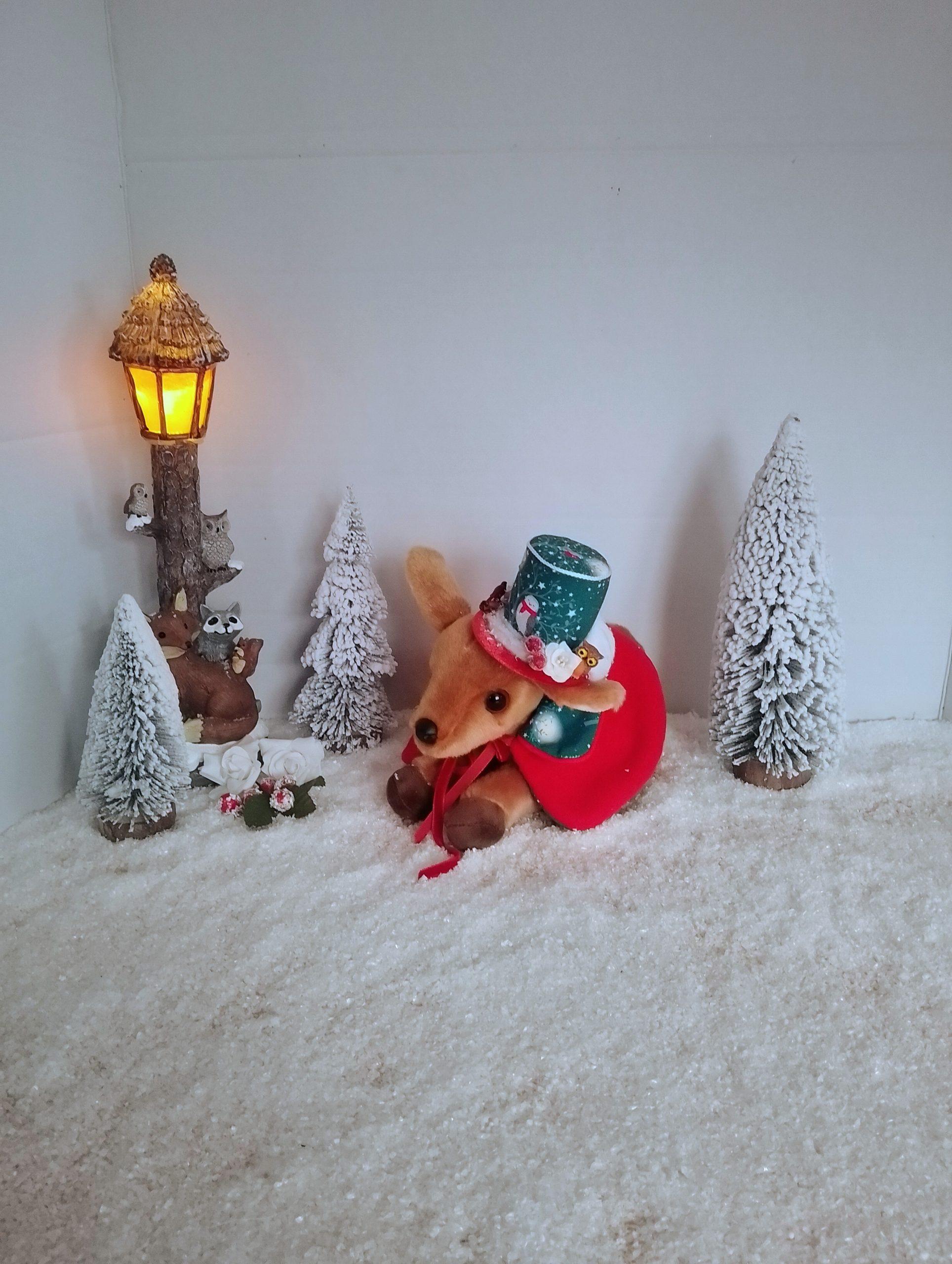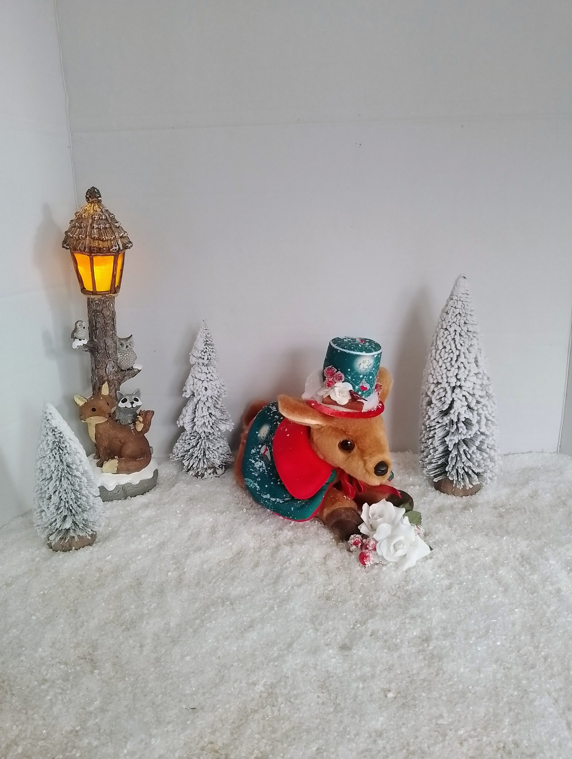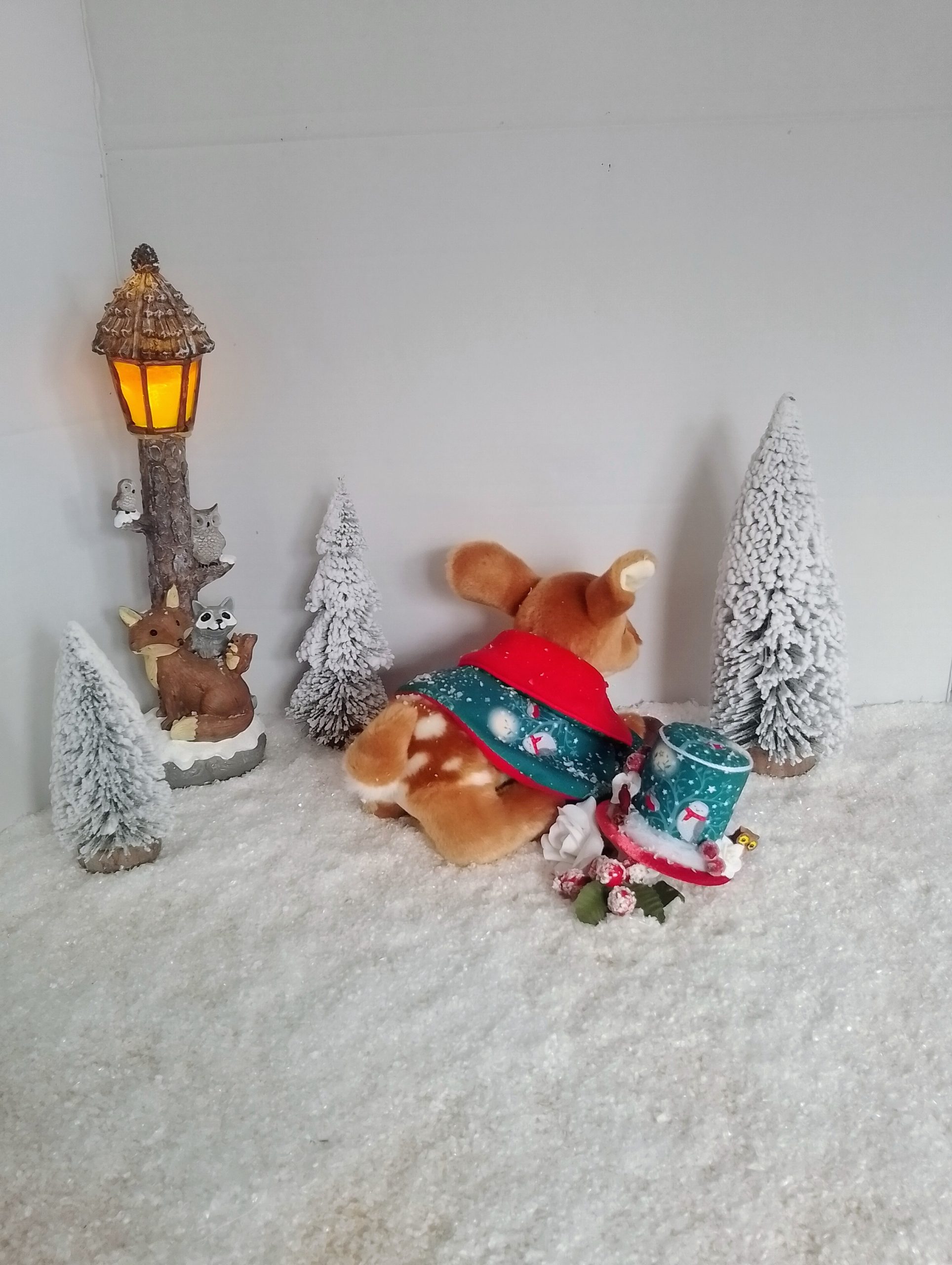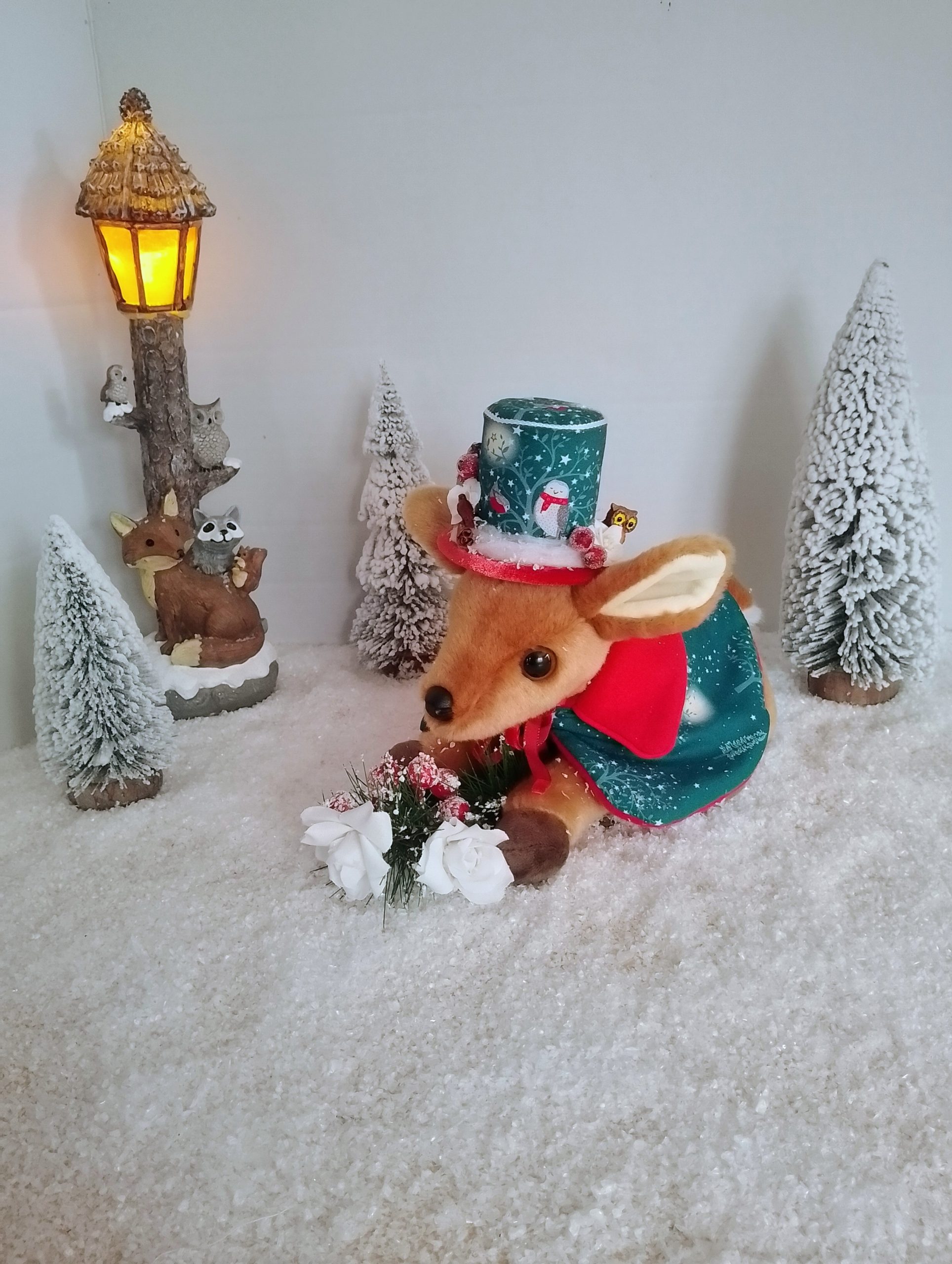 The listing is for the soft toy fawn, the cape and top hat, all other items in the photographs are props and are not for sale.Â