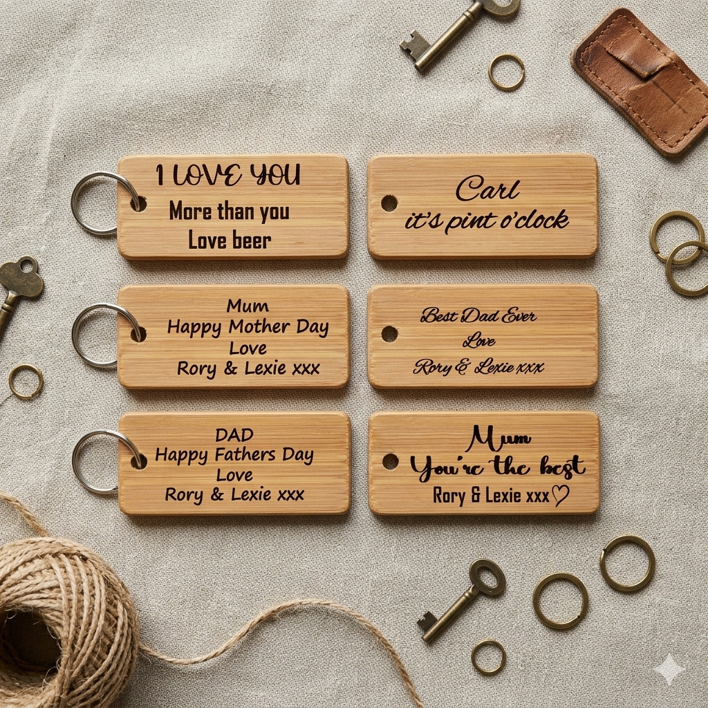 Introducing this premium Bamboo keyring, the perfect accessory for anyone who wants to keep their keys organised and easily accessible. Comes in 3 options and are made to order and custom engraved to your specifications to create a captivating accessory that enhances any outfit with its charm.