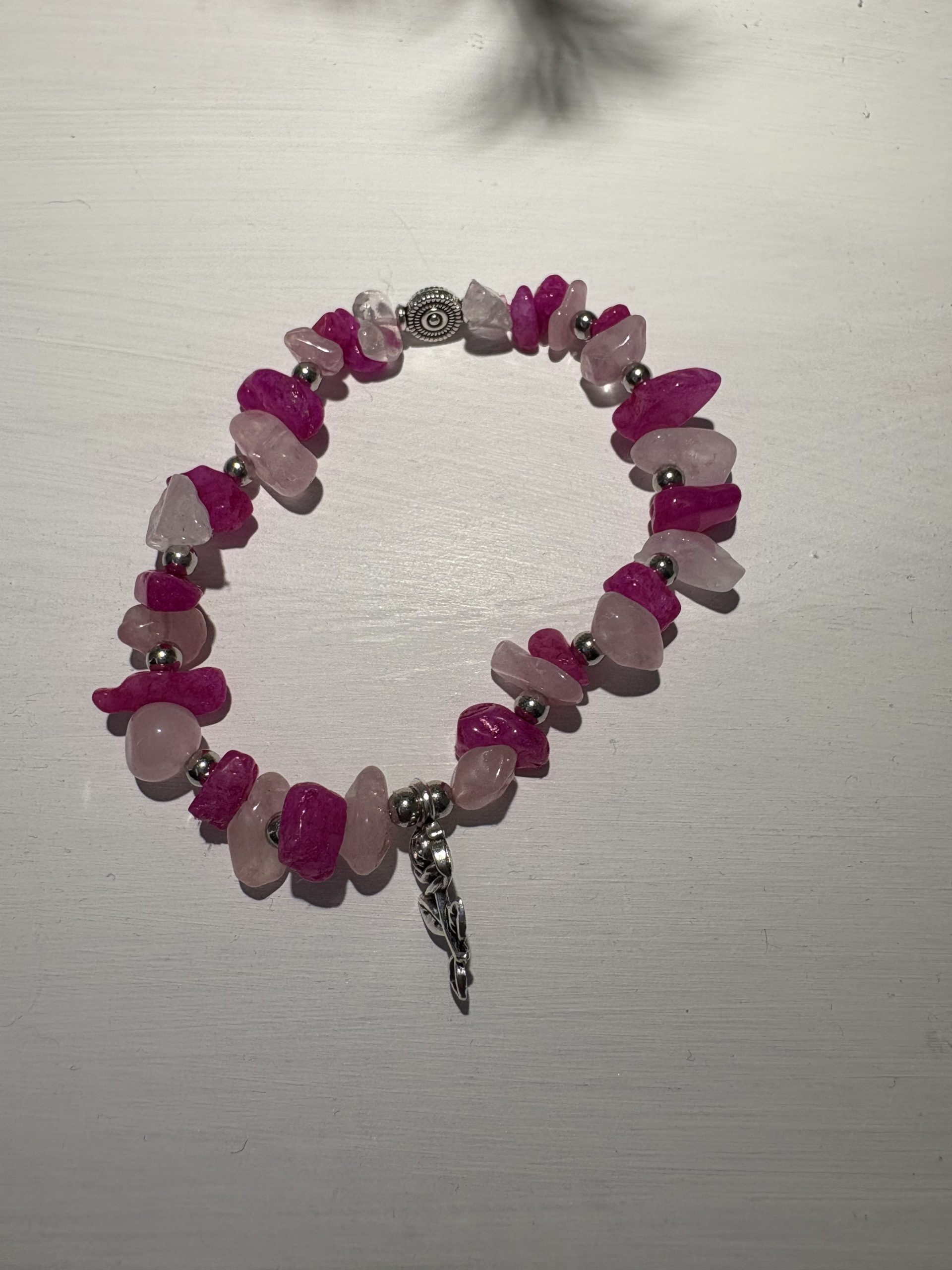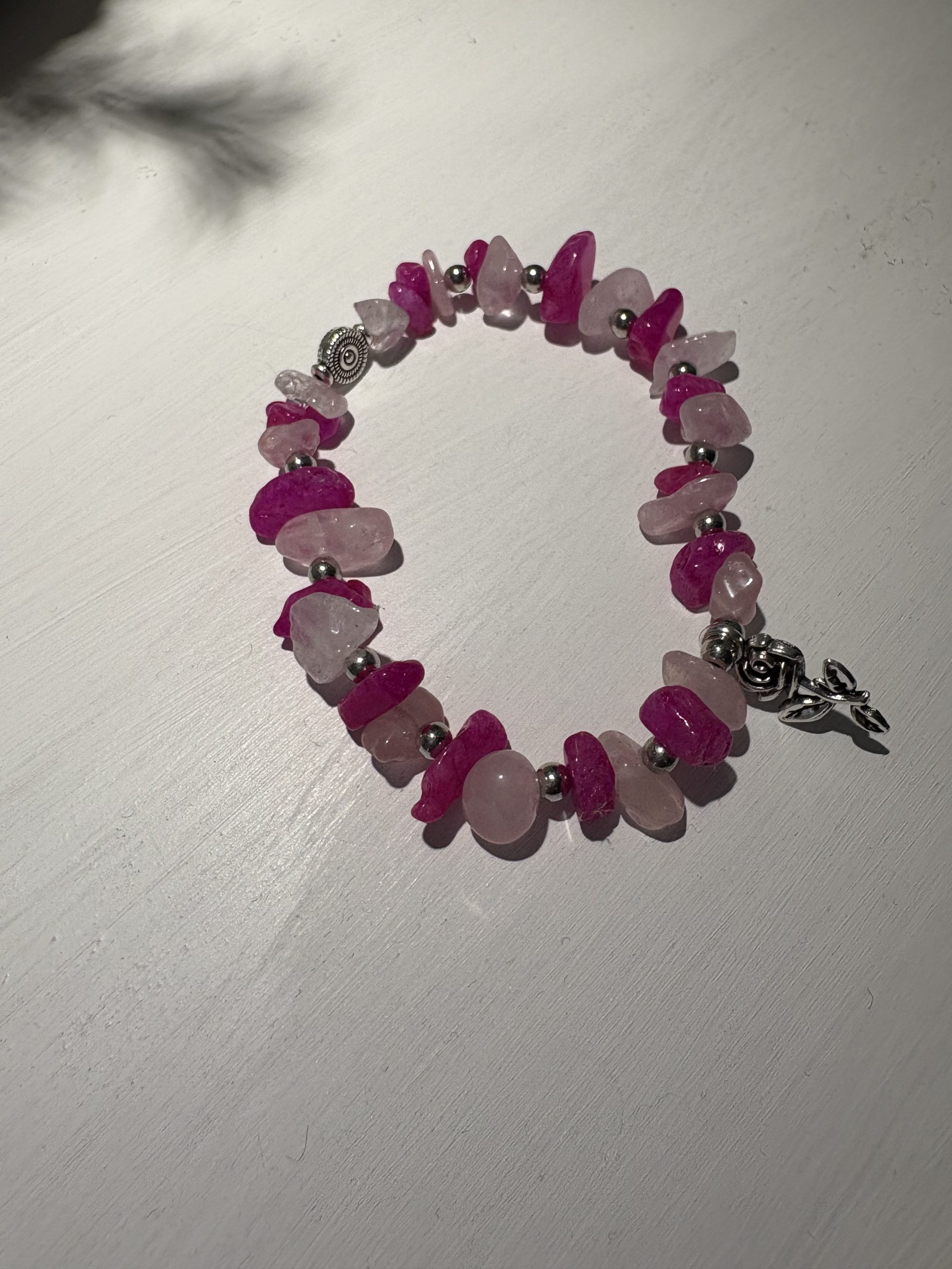 Beautiful pink bracelet with a elegant silver rose charm.